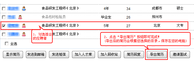 在打开的页面中,选择中意的求职者,然后点击《导出简历》按钮即可。如下图所示: